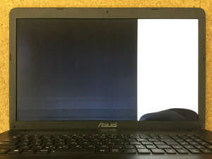 パソコンの電源を入れて画面の状態を確認すると、画面中央付近に黒い帯が出ていて、一部ではWindowsの起動画面が確認できる状態でした。