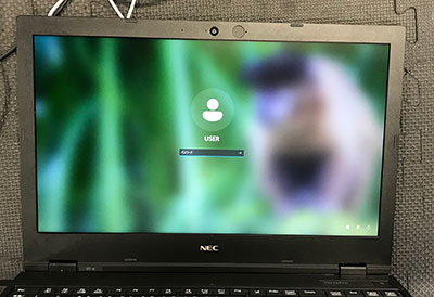 電源を入れると、右下を起点に大きく表示不良が広がり、ログイン画面すらほとんど判別不可能。