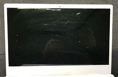 キーボードの上に物を置いたまま天板を閉じてしまい、その瞬間にパキッという音がしてから画面が真っ白になってしまったとのことでした。