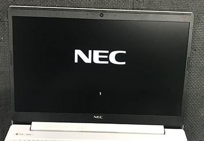 電源を入れるとNECロゴは一部確認できるものの、起動後も画面左側が暗く、正常に使用できない状態でした。
