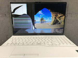 お預かりしたFMVU90H1HEは、パソコンをうっかり落下させてしまった衝撃により、画面の表示に異常が発生していました。