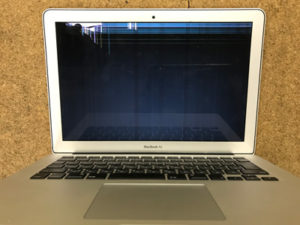 「知人から『壊れているから』と譲り受けたMacBook Air 13インチ(Mid 2013モデル)。電源を入れると、画面全体に縦縞の虹色模様が映り、デスクトップ画面がまったく見えない。外部モニター接続では正常表示されるため、液晶かケーブルの故障だと思われる。」